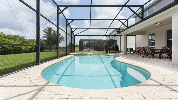 screened swimming pool with a hot tub and an alfresco dining area.