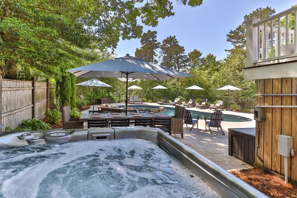Welcome to Starboard Retreat! With its expansive backyard oasis and close proximity to Craigville and Dowses Beaches, this spacious home is a summer paradise for beach goers and pool loungers alike. Overlooking North Pond, the backyard features a heated swimming pool, hot tub, outdoor shower, grill, patio, and fire pit.
