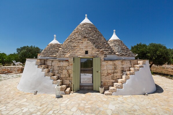Gli ampi spazi esterni consentono di godere appieno del soggiorno all`aria aperta, con giardino curato, aree relax, area pranzo all`ombra del gazebo in bambù. La zona piscina è incastonata in un`area sopraelevata e attorniata da pietre a secco. Attorno alla piscina vi sono i lettini per il solarium e la doccia esterna. La struttura è formata da due corpi fabbrica uniti dall`interno: la villa più moderna e il trullo antico. Nella parte più recente ci sono: il soggiorno con tettoia in legno e divano in muratura, la grande cucina abitabile con volta a botte in pietra rosa a vista, 1 camera matrimoniale con tetto in legno e bagno en suite, 1 camera con letto da 140 cm. Nel trullo sono presenti due nicchie, in cui sono stati inseriti 2 letti matrimoniali, tv e tende oscuranti. La cucina è attrezzata con piano cottura a induzione. I bagni, arredati in stile minimal e completi di doccia, sono in tutto due. I dintorni di Trullo Parthenope a Ostuni