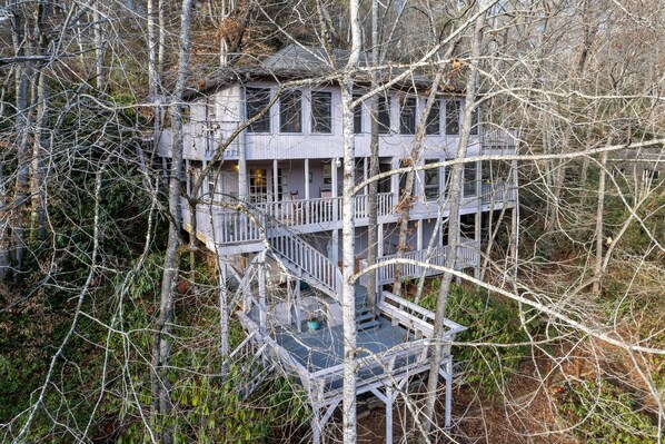 Coweeta Creek is great for fishing and playing in the water - there are stairs and a path leading down to it. Watch and listen to the running water from inside the house or one of the numerous decks. Nearby must-visit attractions include the Smoky Mountain Center For The Performing Arts, Franklin Gem & Mineral Museum, and Dillard(Julep Farms and The Dillard House) - all within eight miles.
