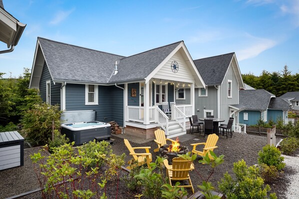 The front yard is a fantastic hang-out spot whether you are lounging in a rocking chair on the covered front porch with views of Sunrise Pool, unwinding in the hot tub at the end of an adventurous day, roasting marshmallows by the fire pit, or gathering around the gas fire table with seating for six for some elegant al fresco dining.