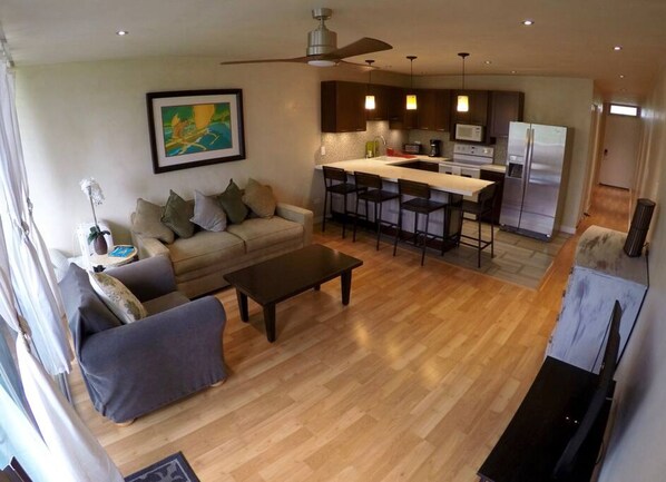 The apartment is a furnished 1 bedroom and 1 bath condo, It is in the 2nd floor in a 3 story walk up building. The building is on Hana Highway, right before Mama's Fish House.
