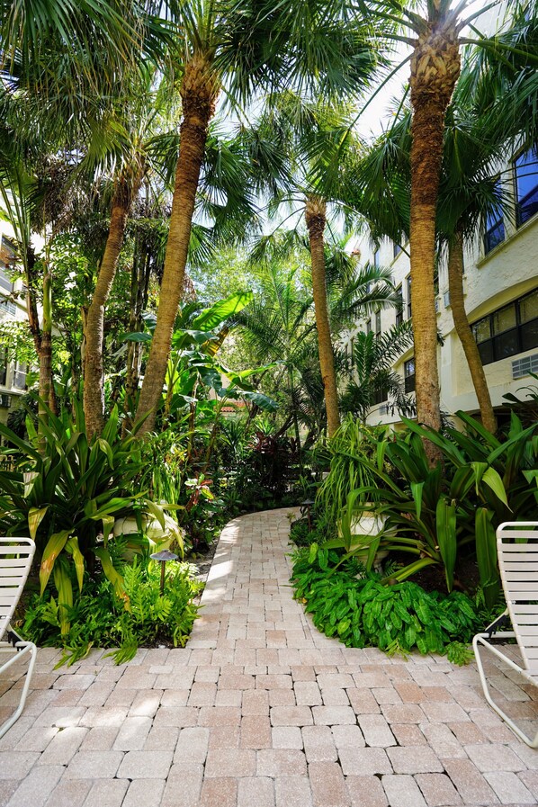 Reception aperta 24 ore al giorno, grande piscina riscaldata tutto l'anno e sedie a sdraio circondate da un lussureggiante giardino tropicale. Centro fitness. Possibilità di barbeque con tavoli e sedie nel giardino. Biblioteca al piano rialzato con tavoli da gioco e comodi mobili per il relax che si affacciano sulla hall glamour. Servizio di lavanderia Negozio di barbiere, salone di bellezza e spa nell'edificio. Il supermercato principale dall'altra parte della strada con deli portare fuori. Ristoranti e negozi raffinati nello stesso isolato. Passeggiata al famoso Breakers Hotel, museo Flagler. I nostri vicini sono St. Chiesa di Edwards (la parrocchia della famiglia Kennedy).