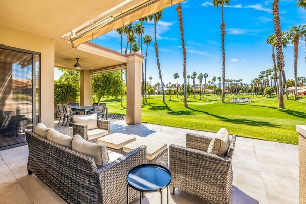 Tranquil, fully renovated spacious three-bedroom with a modern, gourmet kitchen and a beautifully renovated private patio that features mountain views and a built-in barbeque grill. Soak in the sun and enjoy being steps away from a refreshing swim at the best of the 46 pools in the Palm Valley Country Club. Relax at any number of top-notch courses nearby but enjoy being on the 10th hole of the challenge golf course during your stay.