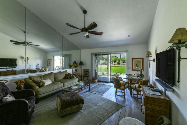 Our stay at this property was disappointing to say the least. The above photo misrepresents the view from the back porch. The photo is angled to give the impression of a view of a golf fairway. In fact the unit is on a tee box, there is about 50 yards of green space leading to a road and a magnificent view of the golf course parking lot. The unit is dated and cluttered with the owners personal stuff. The kitchen is extremely disorganized to the point that we could not cook. The refrigerator was filled with food that we think was the owners which gave off a foul odor. We're not just talking about a half empty Ketchup bottle. We hesitated to do groceries because we did not want to use the fridge. When we opened drawers to store our clothing for the stay we found clothing and other personal stuff. We were given one key which was a struggle every time we needed to open the front door. The bed was awful, it had an old mattress with an ill fitting 6" foam topper on it that moved throughout the night. The result was a lumpy and uneven surface that made sleep difficult. Not to mention the daily 5:00 am wake-up visit from the golf course staff in their tractor. The washing machine was obviously mis-installed in that you could not run a load with cold water. I did bring this to the owners attention who offered to give us a credit for a trip to the laundromat. We could go on. The Palm Desert Resorter facilities were nice. The staff at the Country Club Bar were lovely. Golf Course OK.