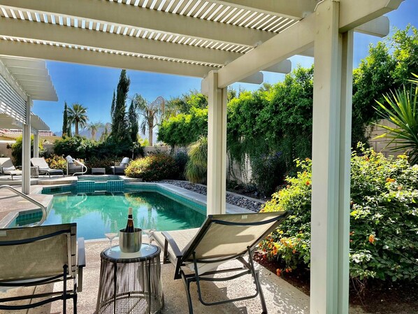 Embrace Coachella Valley's endless sunshine in a private backyard with a large saltwater pool, spa, and shaded lounging area. Savor ruby red grapefruits, oranges, and Meyer lemons for exquisite juices or martinis