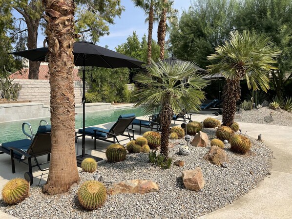 We're pleased to introduce this quintessential and spacious private home on a 10,000 square foot lot in Palm Desert for 28-day minimum rentals. This beautiful home will elevate your senses to a new level of living and relaxation. The modern geometric lines, large windows, expansive sliding glass doors, spacious open floor plan, and lush exterior landscaping with mountain views, allow for seamless integration between the indoor and outdoor areas, encouraging an appreciation of healthy living. This home features 3 spacious bedrooms, ample storage, and two bathrooms, along with multiple outdoor views and access points to the exterior areas. The primary bedroom and ensuite bathroom have direct access to the backyard and pool through the covered patio and include a walk-in closet. The second bedroom with lots of closet space has direct access to the beautifully landscaped front yard. The third bedroom has an enclosed side yard with a private meditation patio and access to the pool via a beautiful citrus-lined corridor. The well-appointed modern kitchen features quartz countertops, a coffee bar, dining area, and access to the relaxing pool. The spacious living area has a decorative fireplace, dining area, a wet bar, with high ceilings and recessed lighting, and skylights which contribute to the transparency and simplicity of this home's minimalist aesthetic, unifying the indoor and outdoor experience. The attached two-car garage conveniently provides direct access to the house, and feature a genuine 220 volt Tesla charger. Additional amenities include central air and heating, modern furniture and fireplace. The amazing outdoor, multi-level desert oasis integrates nature to its full potential. Including an expansive saltwater pool and sundeck with a spa and an integrated waterfall feature, a covered patio with multiple fans, lush and verdant landscaping with palo verde, palms, cacti, succulents, and citrus trees. These amenities and more will inspire you to experience a sense of wellbeing and luxury. Simply paradise! Located in a very nice, quiet neighborhood right next to Shadow Mountain, the home is surrounded by golf courses, high-end shopping, and 5-star dining.