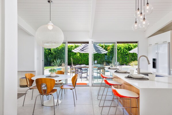 As you step inside, you'll be greeted by a spacious and beautifully decorated living area, designed with comfort and style in mind. Sink into the plush sofas and enjoy your favorite shows or movies on the large flat-screen TV. The open floor plan seamlessly connects the living space to the fully equipped kitchen which features pool views, high end appliances and a large island with breakfast bar seating.
