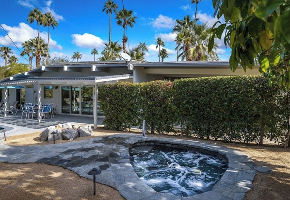 Spend the day relaxing by the classic 1950`s deep pool while enjoying your favorite beverage. Then spend the evening lingering around the fire pit creating memories with friends and family under the stars. The beautiful desert landscape features multiple citrus trees, various flowers, and desert plants.