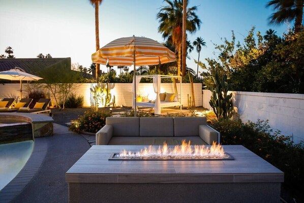 The vast outdoor area features a pool and spa (heated upon request), 4 loungers with umbrella, a cabana daybed perfect for lounging, a BBQ grill, a gas fire table with beautiful custom seating, and plenty of places to enjoy the beautiful Palm Springs weather.
