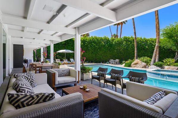 Facing the pool there is a den with a desk, TV and two iconic Barcelona daybeds - perfect twin beds for kids! A hall guest bath has a walk-in shower and access to the pool area.
