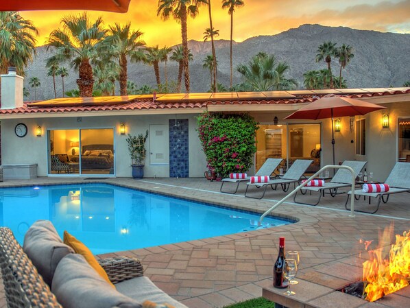 Leggi le recensioni! Composto murato privato. 4 suite deluxe. Piscina molto privata con piscina, spa, funzione di fuoco. Vista sulle montagne Cammina verso la città e Chabad. Parcheggio coperto fuori strada Letti: K, K, K, K (converti in 2 T) Passeggiata veloce al famoso Palm Canyon Drive.