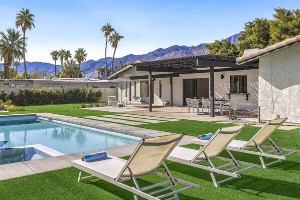 The centerpiece of this outdoor playground is the brand-new sparkling pool and spa (heating optional) perfect for swimming laps or floating aimlessly. The expansive multi-level elevated deck accommodates many activities. It's the perfect spot to capture the breathtaking western views of Mount San Jacinto, soaring 10,000 feet above the desert floor. There are plenty of sleek modern chaise lounges to enjoy a full day of Palm Springs sunshine from the west-facing yard.