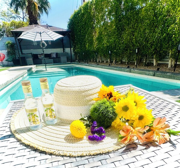 We've built a full outdoors bar-b-q area, fire-pit table with seating; both with natural Gas (NO gas tanks needed), arranged a beautiful outdoor patio with led lights, patio dining area with TV, and pool lounge chairs around the pool and spa, all for your convenience.