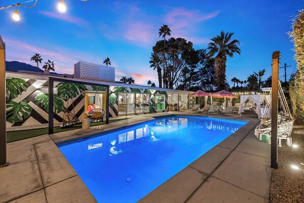 Welcome to The Beverly, a true mid-century experience in Palm Springs! Located in the Little Beverly Hills neighborhood, the interior is inspired by the iconic hotels of Beverly Hills and the swanky elegance of 1950's Palm Springs. This David Rios designed post-and-beam Alexander has 4 bedrooms, 3 bathrooms, an open floor plan with indoor outdoor living at its finest. The breathtaking exterior has a pool, spa, firepits, bar, putting green, outdoor shower and plenty of spots to soak up the