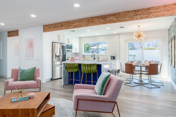 This newly updated 4 bedroom, 2 bathroom California dreaming getaway is styled with our most chic guest in mind. Indoors, you'll find a great open-concept featuring a contemporary kitchen with quartz countertops, a full suite of all new stainless-steel appliances, island top bar, and chic mid-century modern dining area. Prepare your favorite dishes in Caraway cooking ware and set the most gorgeous tablescape indoor or outdoor with designated well-curated dishware.