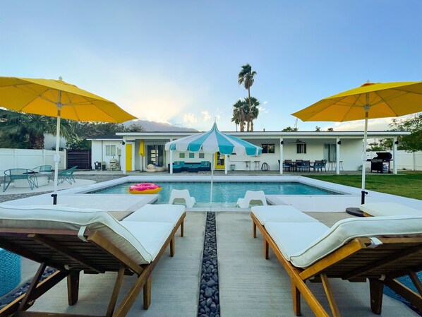 This beautiful MCM styled, spacious Yellow Palm home is perfect for a relaxing Palm Springs vacation. The house is redesigned with new furniture and equipped with all the modern facilities. The private backyard and the pool area with stunning views of the San Jacinto mountains is a perfect place to wind down. The patio is complete with a sectional patio set, outdoor dining set, gas grill and easy-to-use natural gas fire pit. The patio has ample seating for everyone in your gathering to relax and enjoy the beautiful sunrise and sunsets.