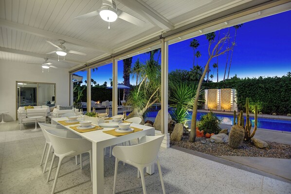 As amazing as the interior of this home is the outdoor spaces truly set it apart. The entire backyard has been walled and gated for privacy. Paseo Palms Estate feels more like an upscale resort than it does a private vacation home. The large pool with tanning ledge and spa, water features, chaise lounges, outdoor kitchen with gas barbecue grill, outdoor bar seating with mountain views, and a conversational fire pit with lots of seating. The backyard also features a covered patio with an ultra-comfortable lounge and a large alfresco dining table in the shade along with a misting system that can make the backyard much cooler in those hot desert days! Access the outdoor shower directly from two of the bedrooms!