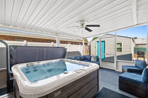Paradise Found features a Hot Tub, a Screened in Patio with seating and TV, and a Rock Fire Pit area.