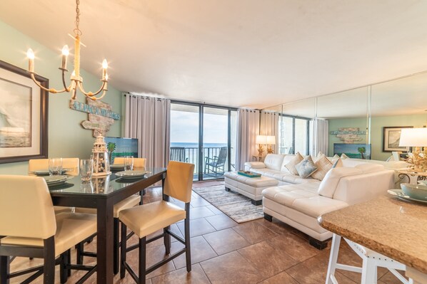 La sala da pranzo, che è anche fronte del Golfo, può ospitare 4 al tavolo e ha più posti a sedere al bar. Esci dalle porte scorrevoli in vetro sul tuo balcone dal soggiorno e dalla sala da pranzo, i panorami sono infiniti! Questo lo rende invitante per mangiare o sedersi e giocare a giochi da tavolo o carte.
