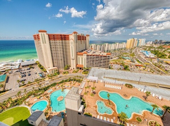 The condo is as pictured!! The view is amazing!! The location is excellent!! Convenient to everything, we walked to our destination. Right across from the beach..amenities on site (we do not recommend eating at PCB pizza & wings, though). Front desk at check-in were not so friendly and did not give direction, we had to ask. I would expect you treat everyone as if it were their first stay at all times. The elevator wait is terrible but we did see a note posted for upgrades. Despite that we really enjoyed our stay. We will be back and hopefully we can get "Blue Mind" again.