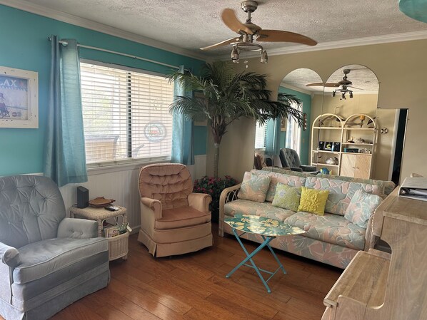Our cozy retreat comfortably accommodates up to four adults or two adults and two children. The bedroom features a queen bed with a new memory foam mattress, while the living room offers a sleeper sofa that converts into a full bed.