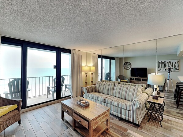 The fully-equipped kitchen is perfect for preparing a post-pool meal or packing up your cooler for a day at the beach! You'll find seating at the bar counter. Relax in the living room and enjoy your favorite show on the large flat screen TV. There’s also a sleeper sofa for additional sleeping space. Picture-perfect views of Panama City Beach's famous sunsets await you on the private balcony.