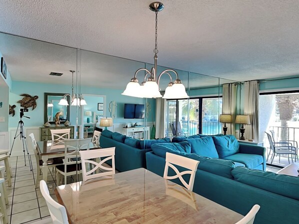 This inviting condo offers two comfortable bedrooms and two full bathrooms, providing plenty of space for everyone to relax. The primary suite features an updated walk-in tile shower, while both bedrooms are filled with natural light and designed with soothing coastal décor. The open living area is perfect for spending time together, kick back on the plush seating, enjoy a movie night, or simply unwind after a day in the sun.
