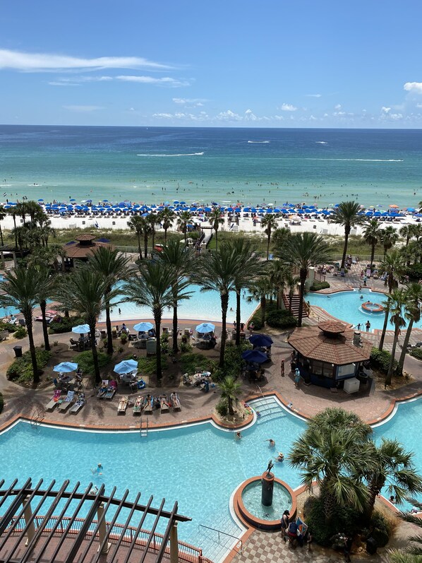From the balcony of this elegant condo you will see spectacular views including the most beautiful beach in Florida and the largest lagoon pool in Panama City Beach! This the right spot to enjoy you morning coffee and watch sun rise.