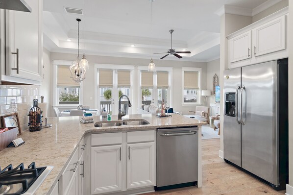 Inside this family and pet-friendly vacation rental, you’ll find 1,200 sq/ft of thoughtfully designed living space offering bright and open interiors. The spacious living area is perfect for unwinding after a day of fun, while the chef-inspired kitchen, complete with premium appliances and ample counter space, invites you to prepare meals with ease.