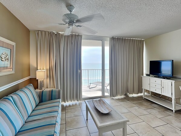 Relax and unwind in the living room, featuring a large flat screen TV and seating for the entire crew. The sofa doubles as a sleeper. You'll find the fully equipped kitchen ideal for whipping up everything from a quick snack to an elaborate seafood dinner. Enjoy your meal inside at the dining table or head out to the expansive private balcony and dine al fresco. Panama City Beach’s famous sunrises and sunsets await! Take your morning cup of coffee or your evening glass of wine outside and breathe in that fresh, salty air!