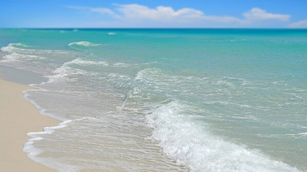 Sia il soggiorno e la camera da letto principale hanno accesso al balcone curvo over-size che si affaccia sulla spiaggia di sabbia bianca e le acque turchesi del Golfo.