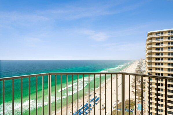 This condo features one of the largest private balconies in Panama City Beach, accessible from each room and wrapping around to provide breathtaking views of the Gulf, the city, and the bay. The balcony is the perfect place to relax and unwind while enjoying the stunning sunsets and panoramic views.