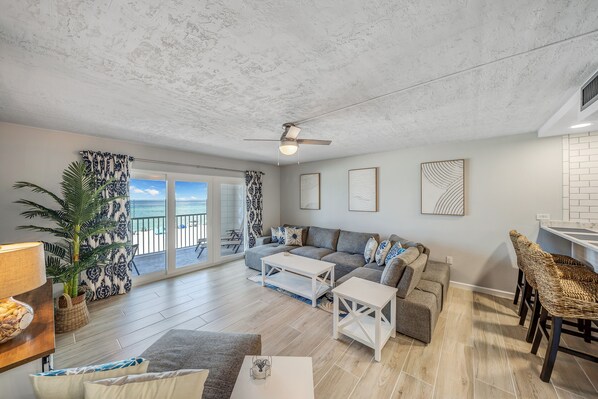 This 4th floor unit was completely remodeled in 2022. The owners spared no expense when installing all new flooring, paint, and vanities and updating the coastal furniture and decor. Boasting approximately 900 feet of luxury living space, this unit includes a fully equipped kitchen, spacious living area, dining area, one bedroom with 2 Queen sized beds, one ensuite bathroom with a walk-in shower, hall bathroom with shower/tub combo and private exterior laundry room. Dine or lounge on your private covered balcony overlooking the gulf. Perfect getaway for a relaxing beach vacation!