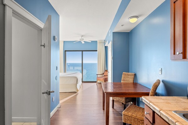 This was a nice unit. The kitchen is very cheaply outfitted but whatever. What I couldn’t get past is that there are two doors you have to go through at the end of a very long hallway to get into the room. Once inside the room, it on has floor to ceiling hurricane glass windows. The smoke detector was missing. We found it on the shelf in the closet on the last morning. With both of my sons being firefighters, all I could think about is if there is a fire, we were going to die. It did have sprinklers, so there was that, but aerial ladders from a fire truck would not reach that high. That leaves you completely dependent on sprinklers. Very scary!