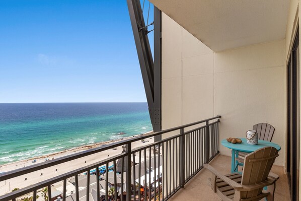 Cool off in the pool or watch sunset from the hot tub while overlooking the Gulf of Mexico. Enjoy home cooked meals, game nights, movie nights, and sunset watch parties with all of your friends and family in this spacious condo. Pour yourself a glass of wine while you watch the sunset on the oversized balcony or take an evening stroll on the beach because this unit comes with private beach access. In the fully equipped kitchen, you can whip up a dinner for the whole family, or hey you're on vacation just walk right across the street to Sharkys (Your kids eat free when staying in this unit). This is a can't beat location, just 1 mile to Pier Park and PCBs most loved restaurants.