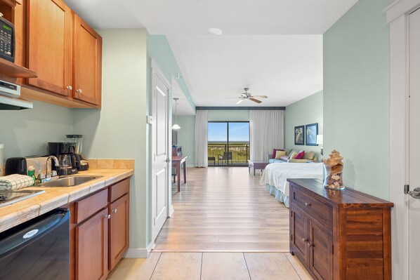 Studio King condo units include one king bed, a pull-out sofa sleeper, a living and dining area with a mini-refrigerator, microwave, sink, coffee maker, 1-flat-screen TV, 1-full bath, as well as private beach access and covered parking.