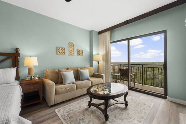 Studio King condo units include one king bed, a pull-out sofa sleeper, a living and dining area with a mini-refrigerator, microwave, sink, coffee maker, 1-flat-screen TV, 1-full bath, as well as private beach access and covered parking.