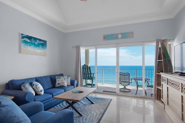 The condo has amazing views from living room and bedroom. The balcony was our favorite place to enjoy the views. The chairs were perfect overlooking the spacious balcony. Would definitely stay there again! Only thing I would change if I could would rather have a walk in shower instead of the jet tub.