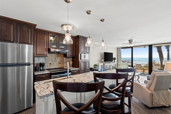 Upon arrival, you will immediately be drawn to the breathtaking views of the Gulf from the poolside patio! Look out over the resort-style pool straight to the sugar white sand and turquoise water. You are truly just steps to the pool and beach! The living area has a 75" smart TV and a NEW! Queen sleeper sofa added in 2026. The custom kitchen has counter seating for 3, along with a bistro table and 2 chairs. There is also plenty of seating on the Gulf-front, pool-side patio where you can relax and take in the BEAUTIFUL view! Unit 104 sleeps up to 5 guests.