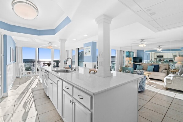 The primary bedroom has a king size bed, a private balcony, an adjoining private bathroom, and a walk-in closet. The 2nd bedroom has a King size bed with an adjoining bathroom. This condo can sleep up to 12 guests! The 270 square foot wrap-around balcony is a wonderful space to gather, watch the kids play in the pool, or just take in the Gulf view! The kitchen has been completely remodeled and is fully equipped with everything you will need to cook for the family. And, there is a washer and dryer in the condo! The dining table seats eight people and the breakfast bar area seats four.