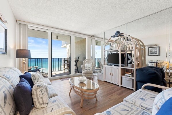 Pelican Walk 704 is a 1 bedroom - 2 bath condo overlooking the East side pool and the Gulf of Mexico. The VIEW from the private balcony is breathtaking! Unit 704 has many enhancements and is family and PET friendly, sleeping up to 4 people. The welcoming ambience and comfortable furnishings will make you feel at home during your next beach vacation. Also, included is a full kitchen with a Keurig coffee maker and a laundry area with a full-sized stacking washer and dryer. The living area has a sleeper sofa and a flat-screen smart televisions. The best feature is the private balcony for lovely views of the beach and blue green water of the Gulf of Mexico,! Ideal place to enjoy morning coffee, an afternoon siesta, or a romantic sunset.