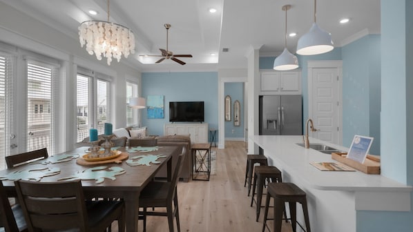 As you walk up the stairs to this 2nd floor townhome you're greeted by bright and sunlit open concept living. The perfect place to entertain, relax, and enjoy time on vacation. Grab a spot on the large sectional to catch up on your favorite TV show. The chef in the family will enjoy the large kitchen space with gas stovetop. Enjoy a quick snack or breakfast at the counter or gather for a family meal at the dining table for 6. Head out on the balcony with your morning coffee to enjoy the Florida sunshine.