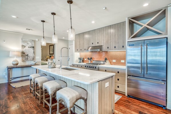 All'interno, goditi tutte le funzionalità di fascia alta in un ambiente professionale e rilassato. Una cucina da chef favolosa e di lusso completa di ripiani in marmo e elettrodomestici Viking è perfetta per preparare un pasto gourmet o uno snack prima di raggiungere la spiaggia. Per vostra comodità, sono forniti una lavatrice e asciugatrice ad alta efficienza. Appena fuori dalla cucina e oltre il bar per la colazione (con posti a sedere per 5) è l'elegante sala da pranzo con 6 posti a sedere. Il concetto aperto continua nel soggiorno con molti posti a sedere per tutti i tuoi ospiti con un esclusivo sezionale, sedie laterali e una grande TV a schermo piatto.