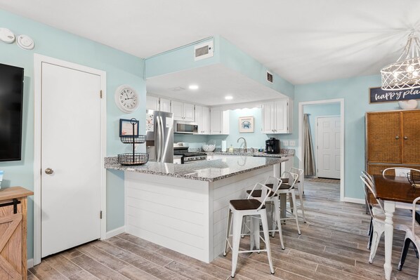 Our townhouse is stocked with quality linens and everything you need for a relaxing vacation. All you have to do is arrive and relax. Park your vehicles directly out the front door with our 2 assigned spaces. No elevators or parking garages to contend with. Enter and exit the community from entrances and exits that are not on Front Beach Road which means less traffic!