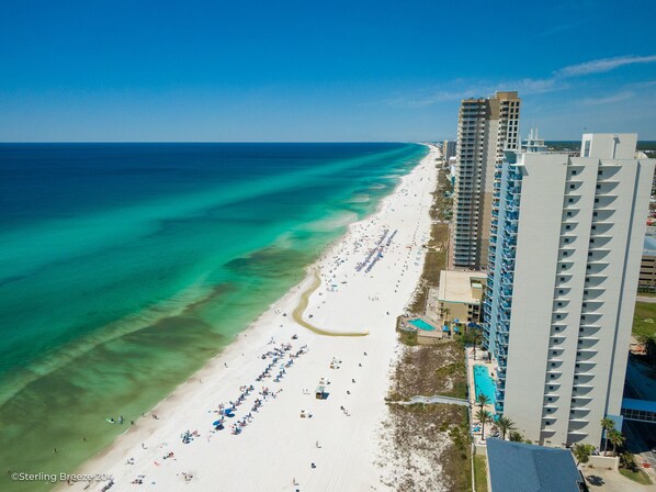 Sterling Breeze is one of Panama City Beaches’ newer beach resorts built in 2008. It is located on the west end of Panama City Beach. Enjoy a ½ mile walk to Pier park, which is Northwest Florida’s premier shopping, dining, and entertainment complex. Very easy access coming from the airport! Sterling Breeze offers many amenities such as a heated infinity edge pool surrounded by a beautiful travertine deck, hot tub, outdoor beachside fire pit, and state of the art fitness center which offers great views of the pool and beach. There is even a snack bar at the pool for cold drinks or a bite to eat.