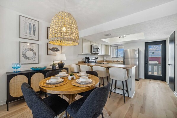 Make yourself right at home in the spacious living room. With beautiful LVP flooring, all brand-new, comfortable furnishings, it's the perfect place to soak in the A/C after a day at the beach. Watch a show on the huge 65" flat screen TV. Open to the living room, the beautiful well-equipped kitchen has stainless steel appliances, a Keurig, and is fully stocked with everything you need to prepare meals and snacks. The primary bedroom also has a 65" TV and is has access the fenced back yard that also includes a laundry room with full size washer/dryer.