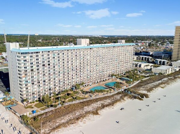 Right on the beach! The condo is beautifully done and was very spacious! The view was beautiful! We couldn't see much of the sunsets from the balcony with the new construction which was a bummer but we just walked down to the beach for the pictures! Our check in was smooth- small minor issue with bathroom but communication was on point all throughout our stay and issues addressed rather immediately! We loved everything in the condo; especially the shower!! It was the perfect amount of space for us! Loved having the washer and dryer also!!! We would stay here again and may do so when our kiddos get bigger! Bikini Bobs and the Cafe are a great perk for convenience, but both do get very busy quickly! There were a few things during our stay that we did not really care for but these things are out of the owners control such as the pool being VERY crowded at night and pretty rough and rowdy to where we did not allow our 8 and 3 year old in the bigger pools, the changing of umbrella numbers daily at tiki hut (would love for one set umbrella number throughout duration of stay), the location at night outside of the gates of the summit is not too kiddo friendly in our mind [sadly think this will not get better with Tootsies coming next door]. However was a great stay for our quick last minute get away!
