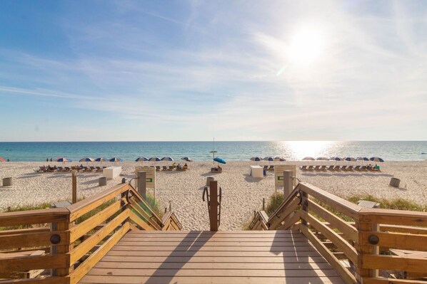 This was really a beautiful place right on the gulf. The condo made you feel like home. Friendly staff willing to check on us. They went above and beyond to give excellent recommendations for dinners, shopping and even a few local artists. They made sure that the resort was clean and secure. I recommend renting the beach chairs and umbrellas. A little pricey but worth not having to lug your own down to the beach. They were having issues with the elevators while we were there which made for long wait times to get places but with as busy as they were we completely understand. Be prepared to walk a lot if you plan on using your car for excursions. The garage is on other side of the street and to get there you need to go through the overpass. Try to park on level 2 if you can but those are the coveted spots. Overall we had a good time in a great location.