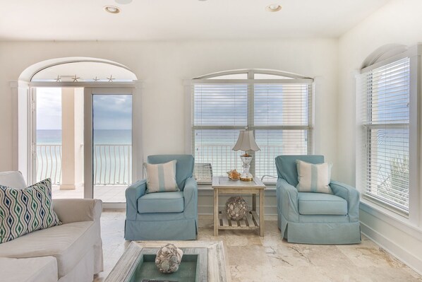 Situato in uno dei tre edifici a 4 piani che si trovano in cima a un promontorio, questo elegante condominio di ispirazione mediterranea si affaccia sul Golfo del Messico, lasciandovi con splendide viste ininterrotte dal soggiorno, dalla zona pranzo e dalla cucina. Le portefinestre si aprono su un ampio balcone coperto, offrendo una vista al tramonto facile e confortevole o una zona relax per gustare il caffè del mattino.
